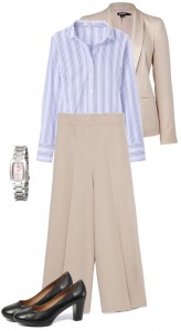 パンツスーツのボトムはややワイドめなラインで重心を下に。